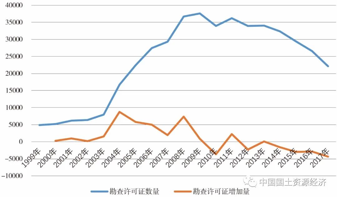 从图1可以看出,矿产勘查资金产出比波动比较大,实物工作量产出比一直呈上升趋势,呈现出不集约现象。地质勘查行业劳动产出比波动较小,呈现较平稳态势,判断劳动要素处于生产集约化状态。资本产出比和实物工作量产出比的变化,一方面是由于找矿难度的加大,属于客观原因,属于人力不可扭转因素;另一方面也说明矿产勘查投入要素的效率并未显著增加。这种依靠传统要素投入驱动型经济增长的模式严重制约了地勘行业的可持续发展。生产要素的生产率提升是产业增长的重要引擎,也是地勘经济增长的主要支撑。长期以来,地勘行业发展仅仅依靠粗放的“量”的投入,通过不断增加地勘资金投入,形成固定要素投入驱动型增长模式。传统经济学理论认为,随着要素投入的不断增加,生产规模报酬将会边际递减。随着地质勘查资金的持续投入,地勘经济的生产规模报酬并未增加,劳动生产率也未出现明显的提高,这都表明粗放型经济增长方式并未提高地勘行业的全要素生产率,也未提高地勘行业的发展质量。2.3 外部环境缺乏保障,体制机制变革衍生众多问题从地勘行业发展的外部环境看,我国经济社会发展进入新时代,自然资源管理迈入新阶段,地勘行业面临经济社会发展内生动力转换、生态文明体制改革、自然资源统一管理等重大形势变化带来的新挑战。而美丽中国新构想,推进绿色发展、生态文明建设等重大举措又为地勘行业转型发展带来了新机遇。从内部环境看,地勘行业已进入分类改革的系统性深化改革阶段,面临传统地质勘查资金投入下行期、地质工作转型升级期、事业单位分类改革适应期的“三期叠加”状态的考验。面对这些内外部环境的考验,多数地勘单位表现出了诸多不适应,仍存在着诸如“事企混合”运行、产业结构单一、业务模式雷同、科技创新能力不足、管理落后等与我国经济社会高质量发展要求不相符的问题。目前,按照事业单位改革要求,各地推动地勘单位经营性国有资产统一监管,事企“分开”改革进入实质性阶段。地勘单位分类改革已经持续了将近15年,有文献认为地勘单位事业“分类”后其“类”的边界仍处于变化调整之中。长期的“事企混合”体制对地勘行业的可持续发展产生了较多的隐患:一是分类改革后公益类地勘单位财政经费仍未得到保障,部分全额财政拨款的公益一类单位存在资金缺口,一些差额拨款的公益二类地勘单位由于财政保障程度低、市场竞争力较差,严重制约了生产和发展;二是在事企混合的体制下,地勘单位由于以前存在的“一套人马、两块牌子”的管理方式,使得地质灾害资质、工程管理资质等出现延续换证变更难和持证人员重复注册等问题,且地勘单位地质灾害治理工程施工、矿山生态修复、商业性矿产勘查等业务的经营依赖于资质等公共资源的支撑;三是事业单位在编人员与非在编人员混岗导致人员安置分流困难,即使能够进行人员的流动和分离,社保和养老问题阻碍了事业单位对经营部分人员的剥离,并且事企分离后人员调配将会受到约束与限制。解决这些问题难度较大,若不能妥善解决,将严重制约地勘单位可持续发展。2.4 传统地质工作产能过剩,地勘单位发展后继无力随着地勘经济市场化程度的提高,政府在传统地质找矿领域的投入逐渐减少,对基础地质和民生地质投入逐渐增加。地勘单位在失去或减少政府提供的地质勘探费之后,便会立即显露出传统地质工作的产能过剩。为应对传统地勘市场的萎缩,地勘单位纷纷转向民生、城市、农业、生态环境、旅游等领域的地质工作,然而这些领域同样有一定的门槛,人才、设备、技术都需要长期积累,不经长远规划,很难形成行业竞争力。面对新时代国家推进生态文明建设对地质工作的新要求,传统地质工作产能过剩、同质化竞争的形势,地勘单位在产业转型升级过程中还存在思想认识不足、准备不充分的问题,并没有培育出差异化竞争的拳头服务产品。探矿权是大部分国有地勘单位的生存根本,拥有探矿权的数量也间接反映了国有地勘单位可持续发展的能力。然而近年来受环境和地方探矿权政策影响,国有地勘单位持有探矿权数量减少较为明显。如图2所示,自2009年我国探矿权数量不断下滑,每年增量基本为负数。而探矿权的维护面临的主要问题有两个:一是与生态保护区重叠问题,只要是涉及生态保护区重叠的探矿权,都必须要注销或者缩小面积;二是由于历史原因,国有地勘单位探矿权大多为财政出资项目,为避免引入社会资本造成权益分配纠纷,主管部门倾向于不再延续该类探矿权。这两个因素导致国有地勘单位探矿权数量迅速萎缩,再加上国有地勘单位现存的优质探矿权本来就很少,难以吸引社会资本投入,也对探矿权的延续造成较大影响。