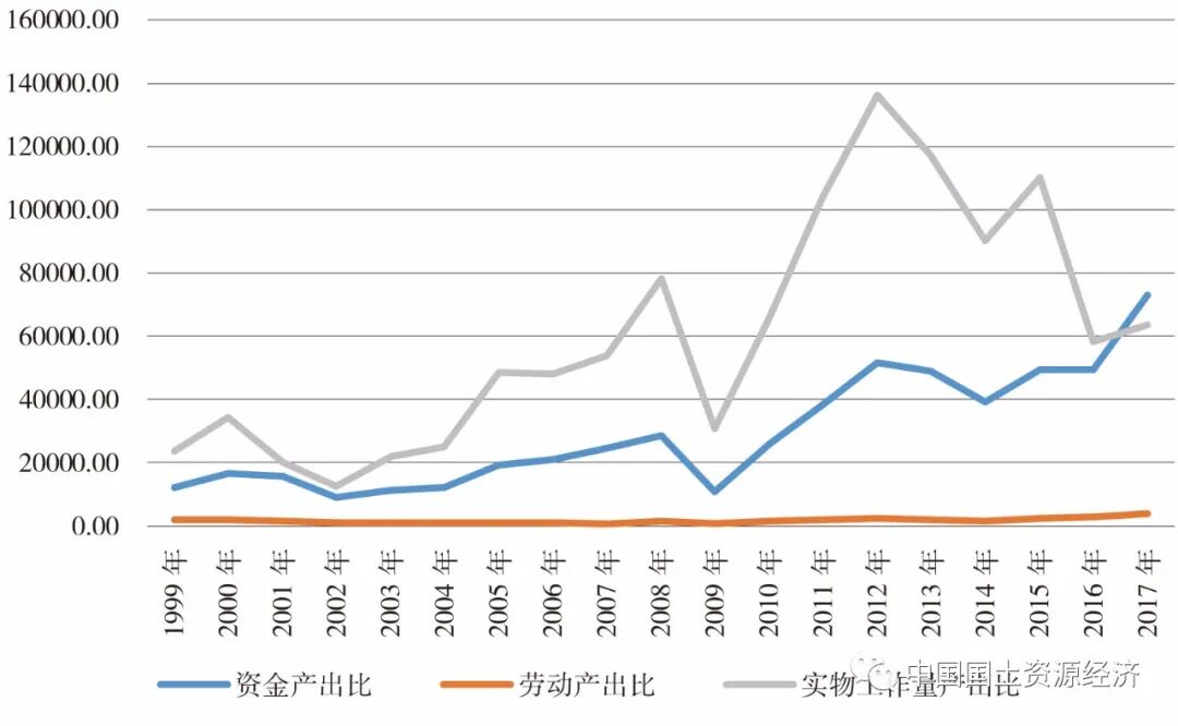 当前影响地勘行业实现高质量发展的限制因素还很多,主要表现在科技创新能力不强,粗放型经济增长方式仍在持续,产业结构单一业务模式雷同等方面。究其原因在于地勘行业科技创新重视程度不足,传统地质工作产能过剩,体制改革进展缓慢等。2.1 科技创新能力一般,基层地勘单位对创新重视不足习近平同志强调,要“充分认识创新是第一动力,提供高质量科技供给,着力支撑现代化经济体系建设”。地质勘查行业作为技术密集型和资本密集型行业,技术的先进程度决定了地勘行业发展潜力。根据问卷统计,58.60%的受访者认为我国地勘行业当前创新水平处于中等水平,创新能力较一般。近些年来,地质勘查行业为提升自身的业务水平,进行了较多的基础理论研究,提出了较多的理论成果,也获得了社会各界的认可。在一些长期以来国外一直采取限制政策的国际尖端技术和独占中国市场的国外技术研究方面,我国地质勘查行业取得了突破性和实质性的进展。但是我国地质勘查行业科技创新方面存在投入不足、经费来源渠道单一,基础研究重视程度不足,科技领军人才稀少,科技创新共享平台缺失,科技成果转化程度不高等问题。基层地勘单位由于收入渠道单一、高科技人才缺乏、设备更新缓慢、科技创新项目获取难等原因,科技创新实力较差。由于长期处于事业体制下,致使基层地勘单位大多对科技创新不重视,缺乏创新精神,创新热情整体不高,从而影响了行业整体发展。目前基层地勘单位普遍缺乏与时俱进的观念创新、管理模式创新和组织机制创新,从而影响了科技创新能力建设:部分基层地勘单位由于机制体制原因一直没有建立科研机构,部分单位由于对科技创新重视不足鼓励科技创新的机制体制未建立或已建立未严格执行,部分单位由于高端科技创新型人才的严重缺乏导致研发支出在总支出中所占比例微乎其微。2.2 传统生产要素不集约,粗放型经济增长制约可持续发展地质勘查行业的生产要素可以分为三种:一是资金,因为地质勘查是一种生产行为,需要人力、设备和原材料,而这一切必须以现金流为支撑;二是地质勘查专业队伍,这个队伍不是专指人员,而是各种地质技术人员、专业技能和地质勘查技术装备的综合;三是地质调查或勘查的空间,它是地质勘查的“劳动对象”。本文以矿产勘查为例分析地勘行业的生产要素集约化程度,从而考查整个地勘行业的生产效率。三种生产要素可以分为矿产勘查资本投入、矿产勘查人员投入和实物工作量投入。由于地质勘查空间不可测量,本文使用地勘实物工作量作为衡量标准。以新发现矿产地作为矿产勘查的产出,计算矿产勘查劳动产出率、资本产出率和实物工作量产出率(图1)。