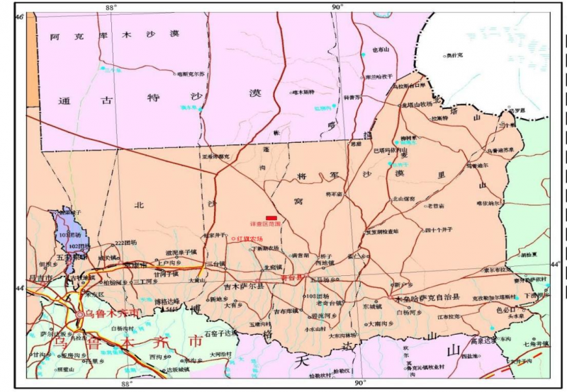 地理位置:准噶尔盆地东南部古尔班通古特沙漠边缘,行政区划隶属新疆生产建设兵团第六师管辖,位于五家渠市东侧130km处,吉木萨尔县场北侧35km处,距红旗农场场部约16km。自红旗农场场部经二幸线乡村公路及便道可直接到达详查区的北部,交通较为便利。范围:东经89°11′46.00″~89°12′54.00″;北纬44°17′46.00″~44°18′50.00″。