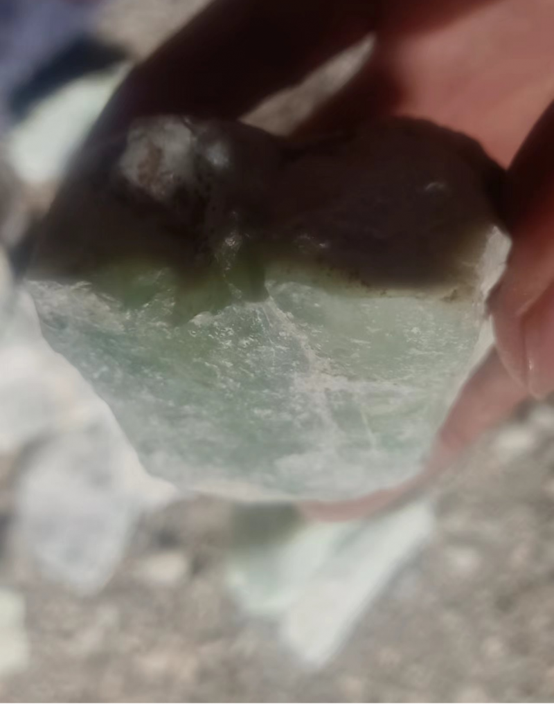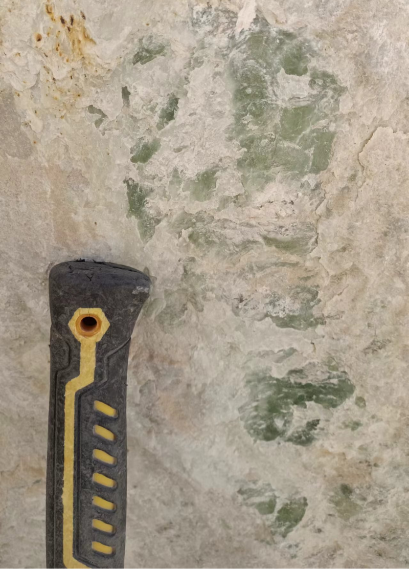 (4)非金属矿体特征在硅化大理岩带的南侧,发现了零星的岫玉化大理岩。基本岫玉透光性较好,质较软,岫玉呈团块状,不连续,厚度多在1-10厘米,长宽在5~20厘米之间(见下图)。