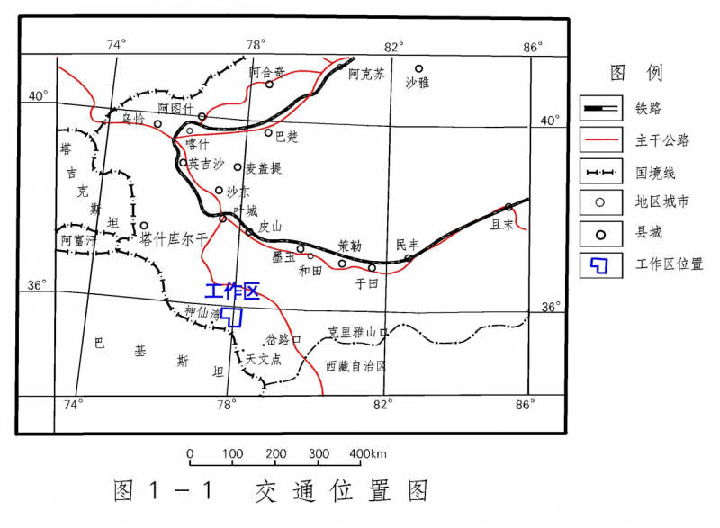 矿区位于新疆皮山县赛图拉镇,行政区划属新疆皮山县管辖。矿区交通较方便,和田县工业园区至矿区共计404千米。其中,和田县工业园区走G580国道至康西瓦达坂271千米,康西瓦到神岔口卡点33千米,神岔口卡点到矿区100千米,仅有进矿区10千米土石沙路,其余均为国防公路。