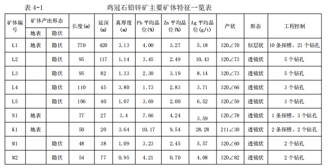 矿区共圈定9条铅锌矿体,其中地表矿体3条,编号为L1、N1、K1,其它矿体为隐伏矿体。矿区主要矿体为L1、L2、L3、L4、L5、N1、K1、M1、M2 等(表4-1),其中L1号矿体规模较大,为矿区主矿体,也是本次详查工作的重点矿体,其余为规模较小或单工程控制矿体。