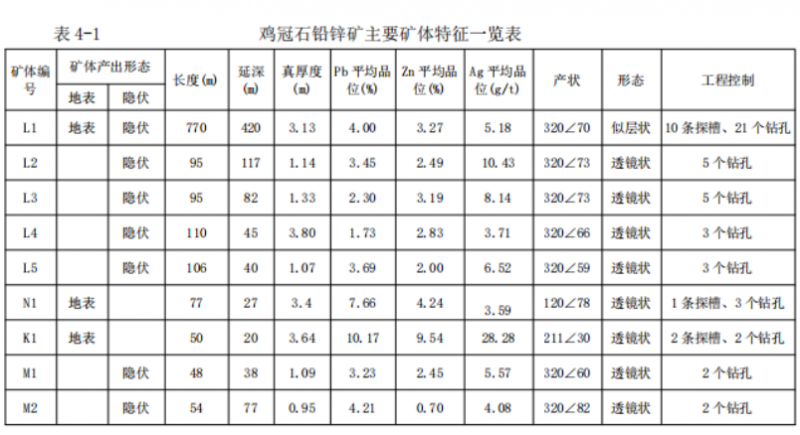 矿区共圈定9条铅锌矿体,其中地表矿体3条,编号为L1、N1、K1,其它矿体为隐伏矿体。矿区主要矿体为L1、L2、L3、L4、L5、N1、K1、M1、M2 等(表4-1),其中L1号矿体规模较大,为矿区主矿体,也是本次详查工作的重点矿体,其余为规模较小或单工程控制矿体。
