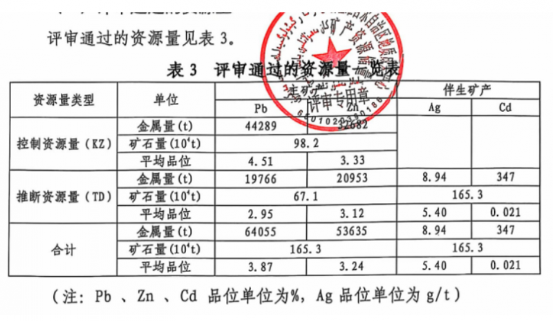矿石量165.3万吨,铅金属量64055吨,锌金属量53635吨,铅平均品位3.87%,锌平均品位3.24%。伴生银金属量8943千克,平均品位5.40g/t,镉金属量347吨,平均品位0.021%。